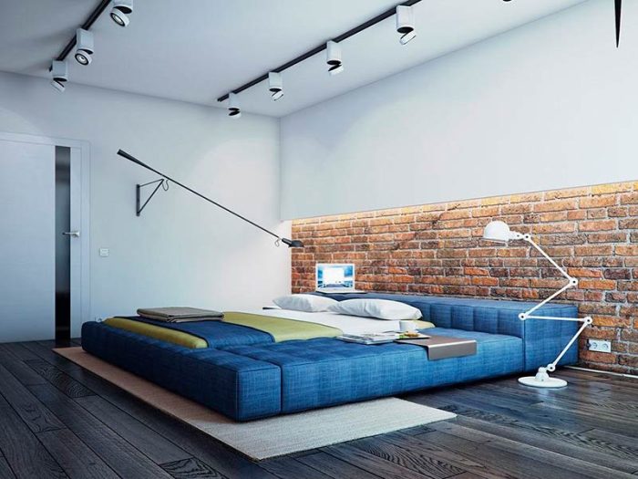 Wandleuchter in Kombination mit Tischlampen auf Nachttischen sehen gut aus. Stehlampen sind eine gute Lösung.