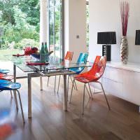 - Für den Minimalismus eignen sich monochrome Kunststoff- oder Glasstühle mit lakonischem Design;